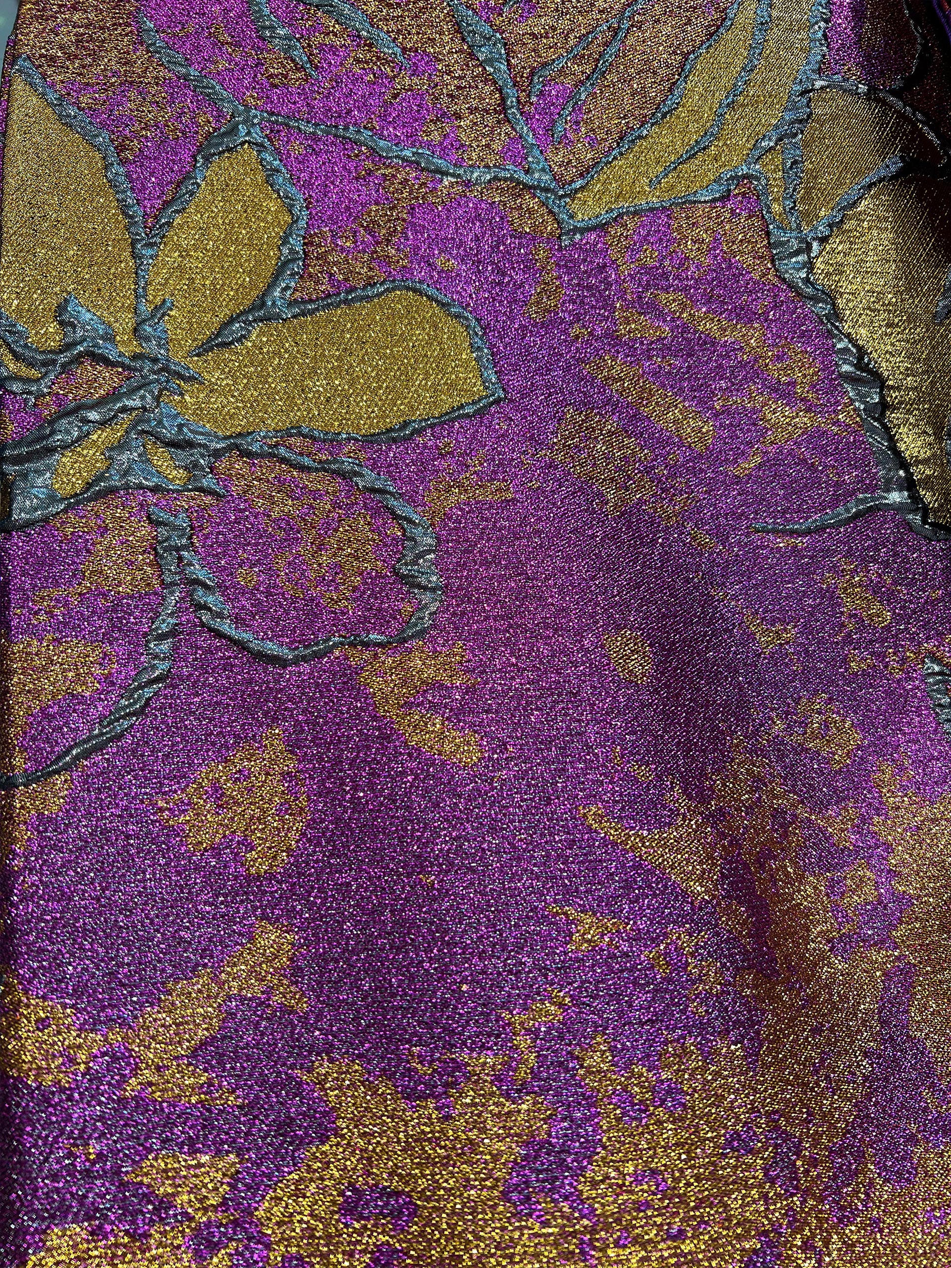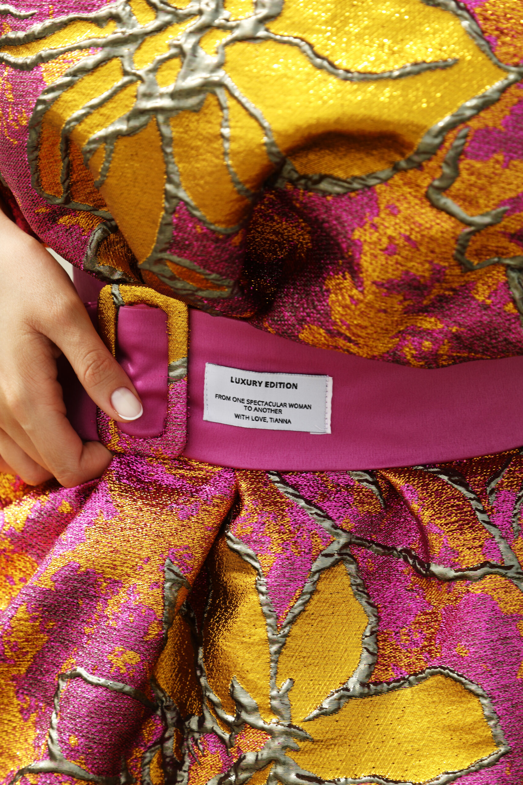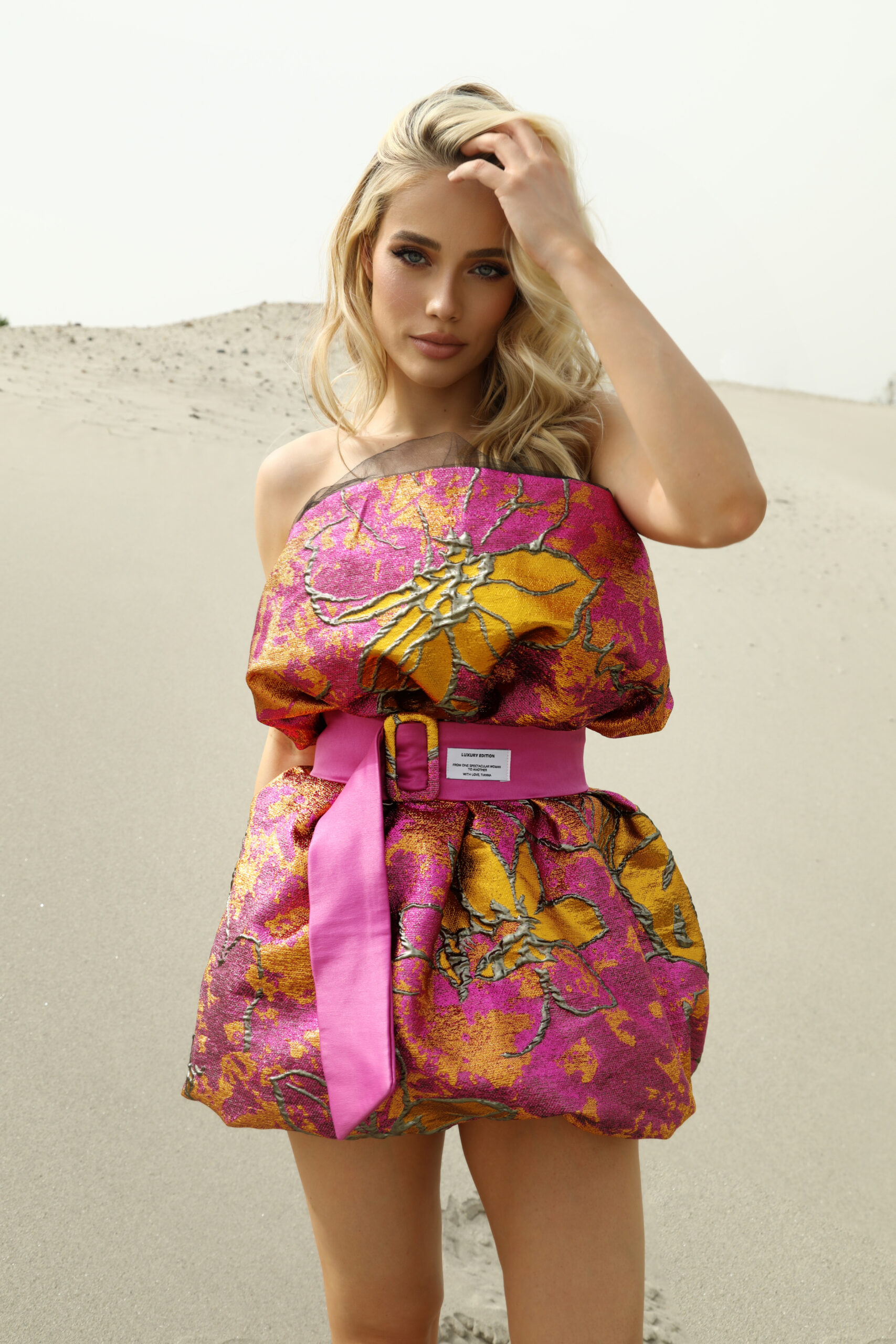 Mini, voluminous, puff dress made of brocade with adjustable buckle belt.