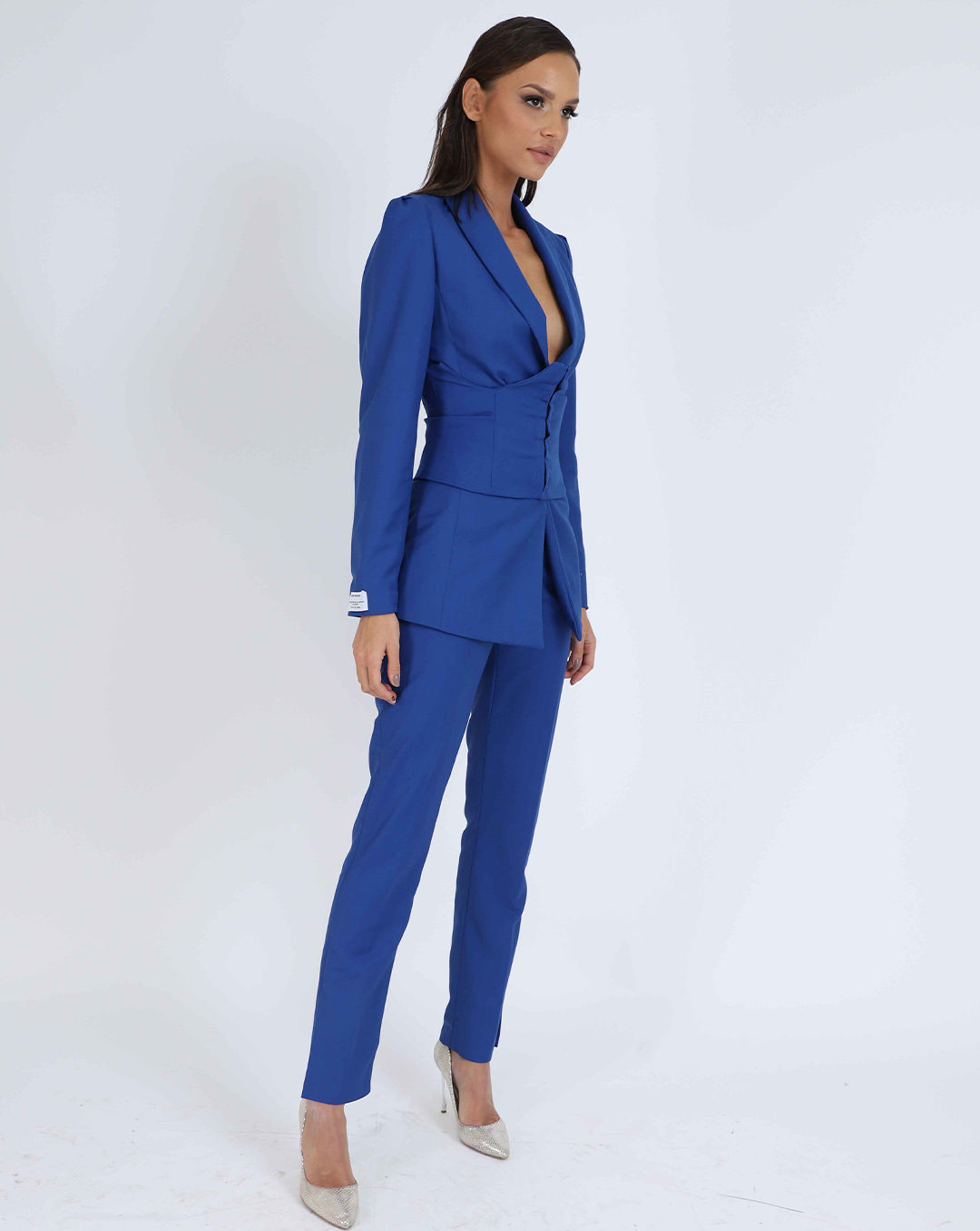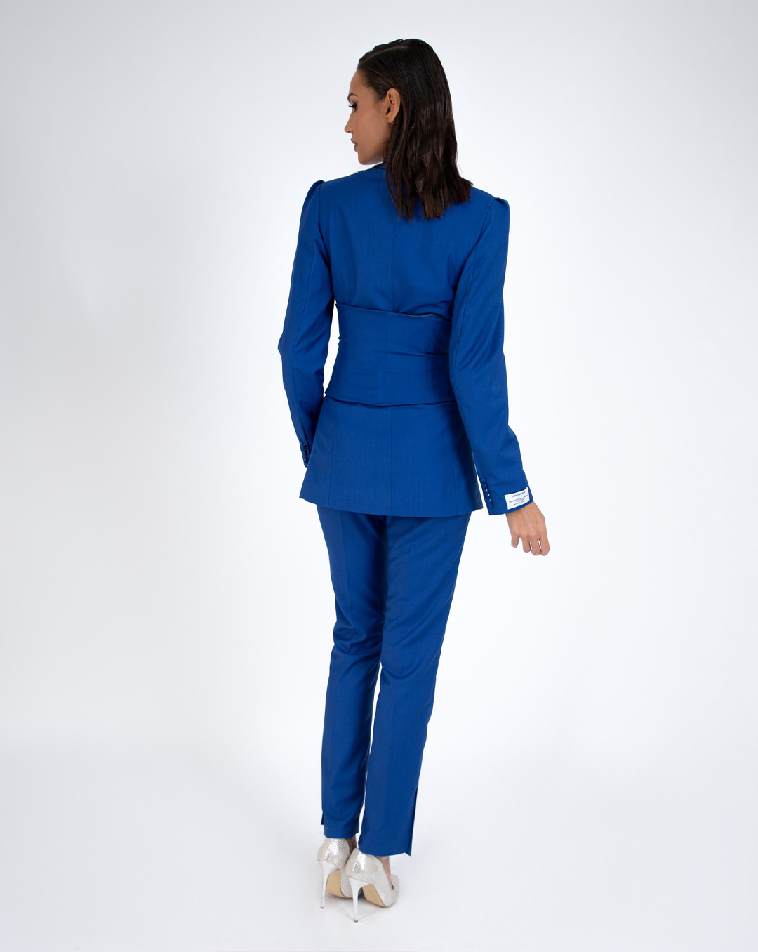 All of three pieces are made of finest wool canvas. Waisted blazer with accentuated shoulders and buttons on sleeves. Tight belt with buckles. High waist tight pants.