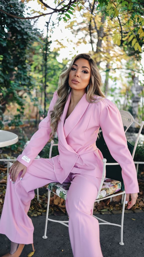 Sako sa duplim kopčanjem, sečen u struku, sa karnerima u donjem delu sakoa i puf rukavima.