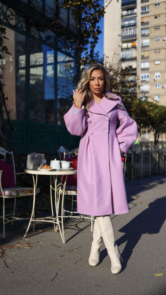 Nežan vuneni kaput sa duplim kopčanjem. Ovaj kaput boje lavande ima svilenu postavu. Njegova lepota leži u velikim puf rukavima i faltama.