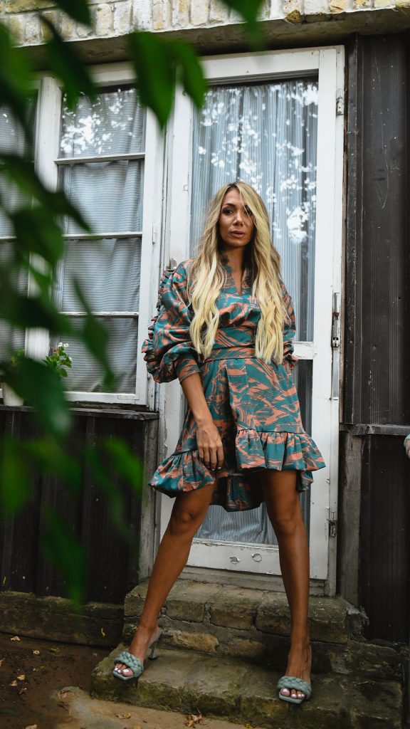 Haljina srednje dužine izrađena od štampanog kepera. Ima voluminozne rukave, pojas i falte na rukavima i na rubu haljine.